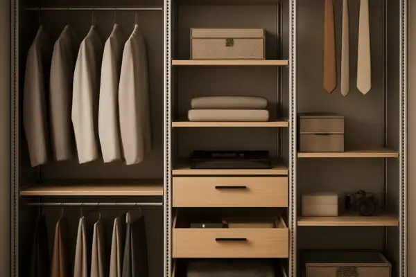 Com os trilhos internos, cada seção pode ser ajustada com precisão. Isso permite distribuir melhor os volumes, criando nichos proporcionais aos itens armazenados. Roupas menores podem ocupar espaços compactos, enquanto objetos maiores recebem áreas adequadas — tudo dentro do mesmo armário.