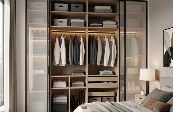 Guarda-roupas modulares deslizantes para suítes otimizadas com acabamento elegante